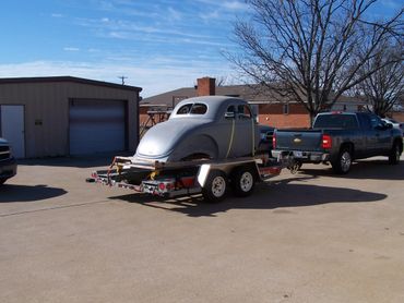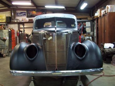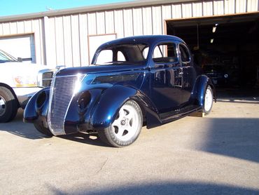 The 37' coupe came to us on a trailer...without a frame. The original frame was chucked in favor of a TCI frame equipped with a 4-link rear, Mustang II front, disc brakes on all four corners, and Ridetech Shockwave airbag suspension. A Boss 302 Crate engine, equipped with a polished Vintage Air Frontrunner, and backed by an electronically controlled AOD overdrive automatic, a beautiful paint job, and custom interior all done in house.